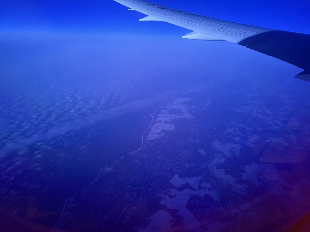 Nakon deicinga krila avion je poletio i vinuo se iznad oblaka koji su zastirali pogled preko cijele Europe sve do Rige. Tada sam vidio nešto tla, jezera, mora i obale, ali uskoro su se opet navukli oblaci, ušli smo i u tamu te iznad Rusije, Mongolije i Kine nisam vidio ništa osim crnila i jednog svjetla na vrhu krila.