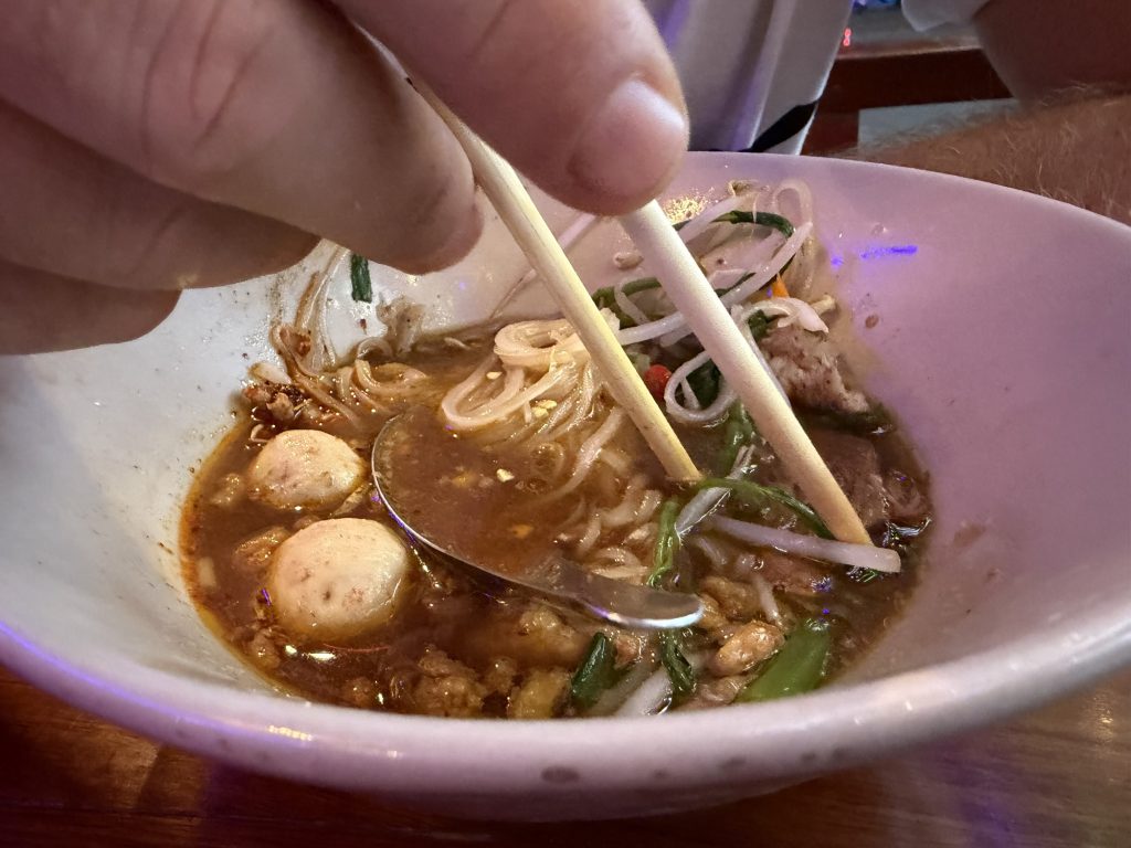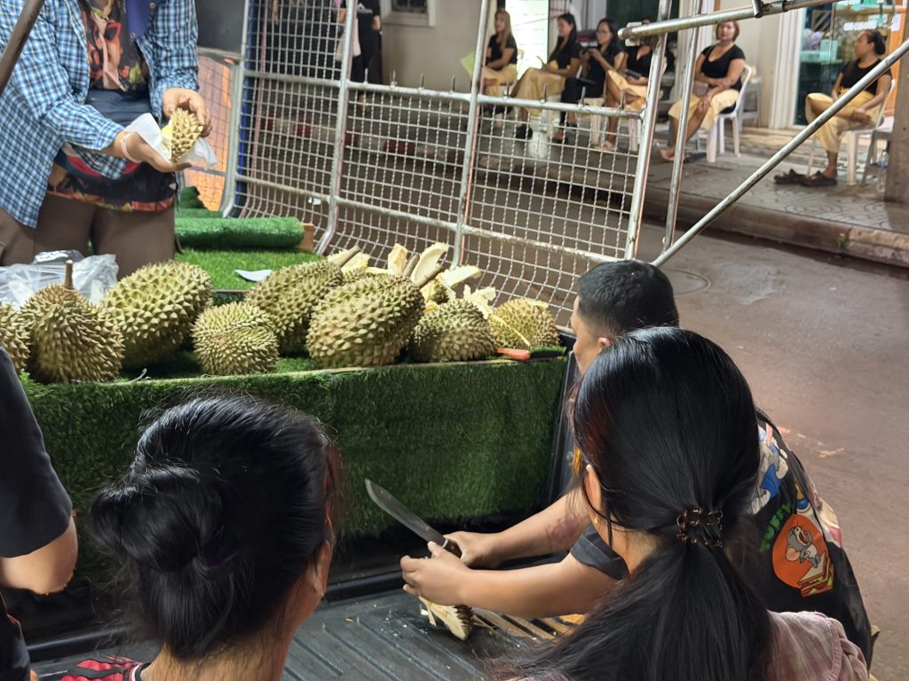 Pokraj nas je u jednom trenutku projurio pick up pun duriana – voća poznatog po vrlo intenzivnom mirisu. Parsto metara dalje pick up je bio parkiran a čovjek je mačetom trančirao velike plodove vadeći jestive koštice. “Probaj, probaj!”, inzistirali su. Ha šta se mora – mora se. Uzeo sam komadić vrlo smrdljive supstance. Sudeći po smijehu i razgovoru između prodavača izraz na mome licu je bio urnebesan. Okus isprva bljutav, gnjecave teksture. Nisam bio sretan, ali kako je vrijeme odmicalo okus je postajao sve bolji da bi mi na kraju usta bila prepuna voćnog i osvježavajućeg okusa. Zanimljivo iskustvo.